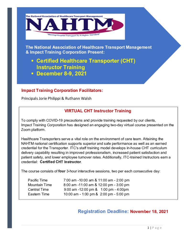 The National Association of Healthcare Transport Management & Impact Training Corporation Present: Certified Healthcare Transporter (CHT) Instructor Training December 89, 2021 Impact Training Corporation
