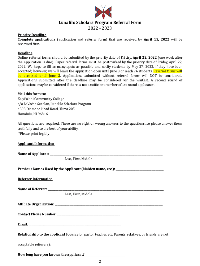 Luna lilo Scholars Program Referral Form 2022 2023 To submit this form online the student must first complete the online application, which will trigger an online referral form to be sent to you:
