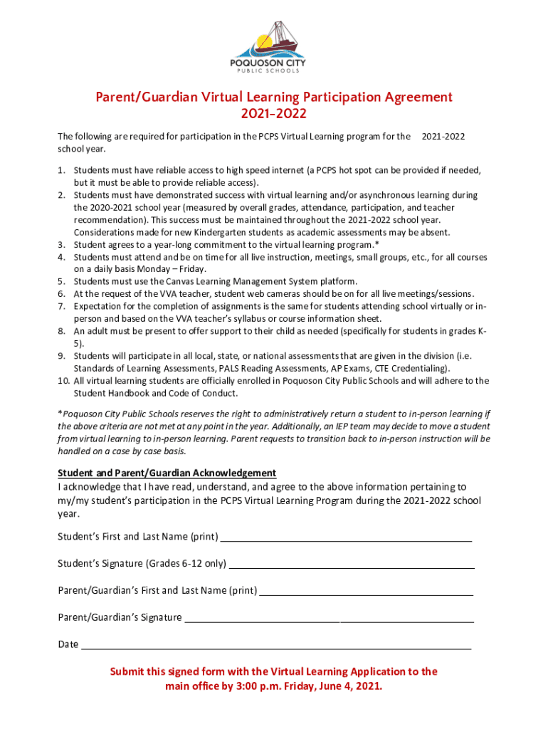 Parent/Guardian Virtual Learning Participation Agreement 20212022 The following are required for participation in the PCs Virtual Learning program for the school year.202120221. Students must have