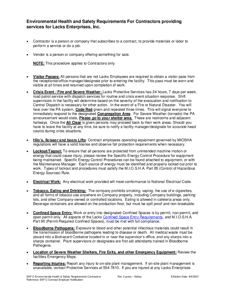 Environmental Health and Safety Requirements For Contractors providing services for Lacks Enterprises, Inc. Contractor is a person or company that subscribes to a contract, to provide materials or