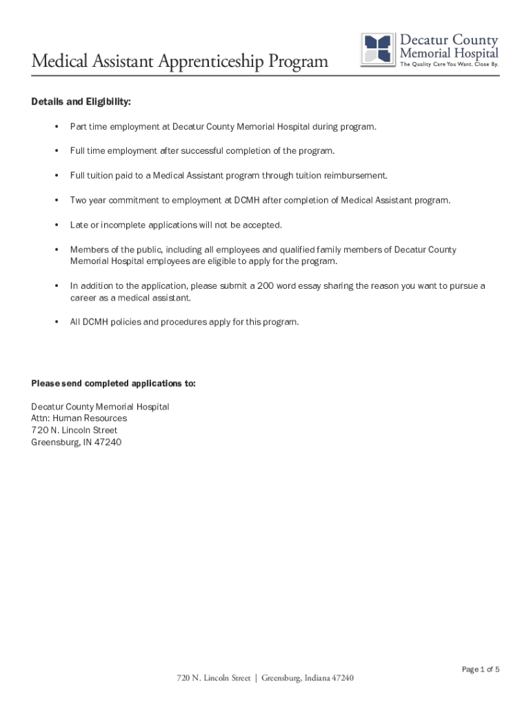 Medical Assistant Apprenticeship Program Details and Eligibility: Part time employment at Decatur County Memorial Hospital during program. Full time employment after successful completion of the program.