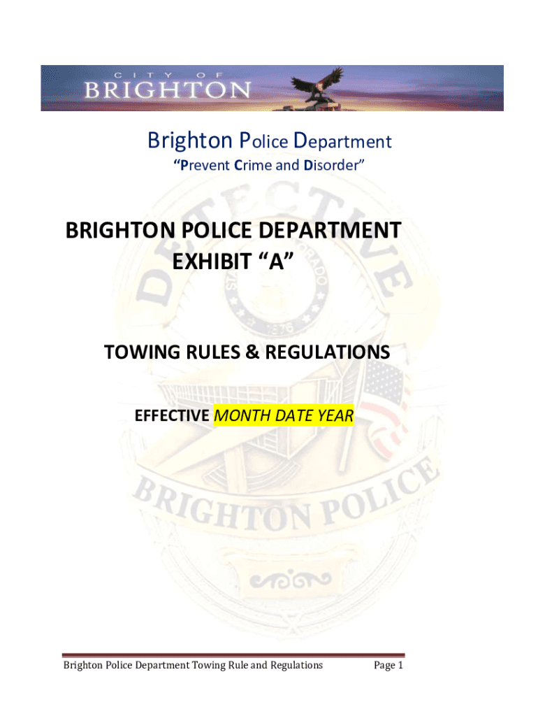 Brighton Police Department Prevent Crime and DisorderBRIGHTON POLICE DEPARTMENT EXHIBIT TOWING RULES & REGULATIONS EFFECTIVE MONTH DATE YEAR Brighton Police Department Towing Rule and Regulations