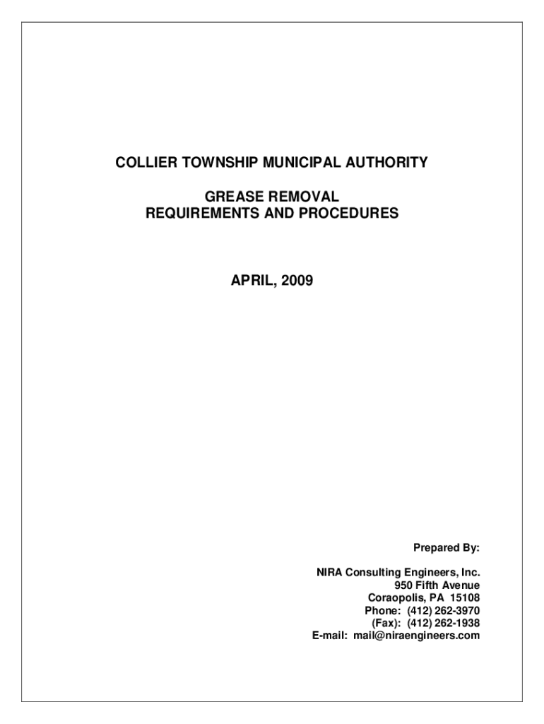 COLLIER TOWNSHIP MUNICIPAL AUTHORITY GREASE REMOVAL REQUIREMENTS AND PROCEDURESAPRIL, 2009Prepared By: IRA Consulting Engineers, Inc. 950 Fifth Avenue Acropolis, PA 15108 Phone: (412) 2623970 (Fax):