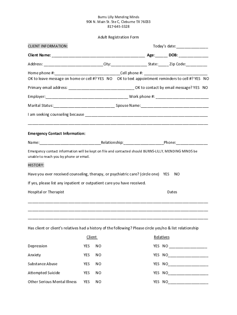Burns Lilly Mending Minds 904 N. Main St. Ste C, Cliburn TX 76033 8176453328Adult Registration Form CLIENT INFORMATION:Today's date:___Client Name: ___ Age:___ DOB: ___ Address: ___City:___ State:___