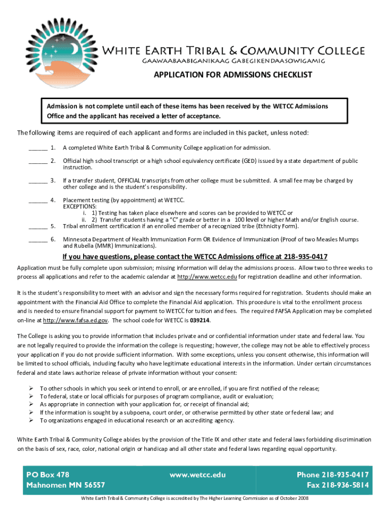 APPLICATION FOR ADMISSIONS CHECKLIST Admission is not complete until each of these items has been received by the TCC Admissions Office and the applicant has received a letter of acceptance. The following