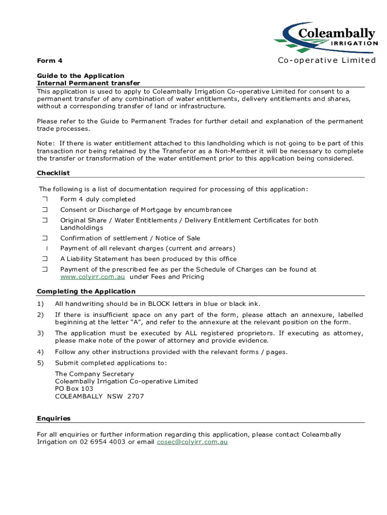Form 4Cooperative LimitedGuide to the Application Internal Permanent transfer This application is used to apply to Coleambally Irrigation Cooperative Limited for consent to a permanent transfer of