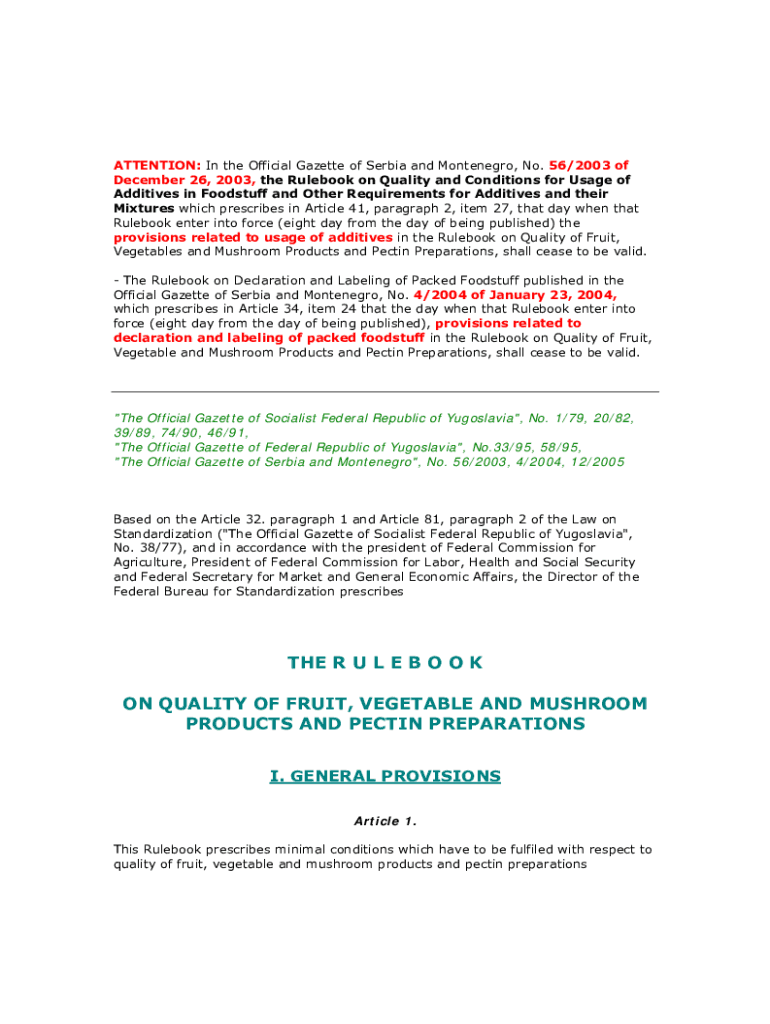 ATTENTION: In the Official Gazette of Serbia and Montenegro, No. 56/2003 of December 26, 2003, the Rule book on Quality and Conditions for Usage of Additives in Foodstuff and Other Requirements for