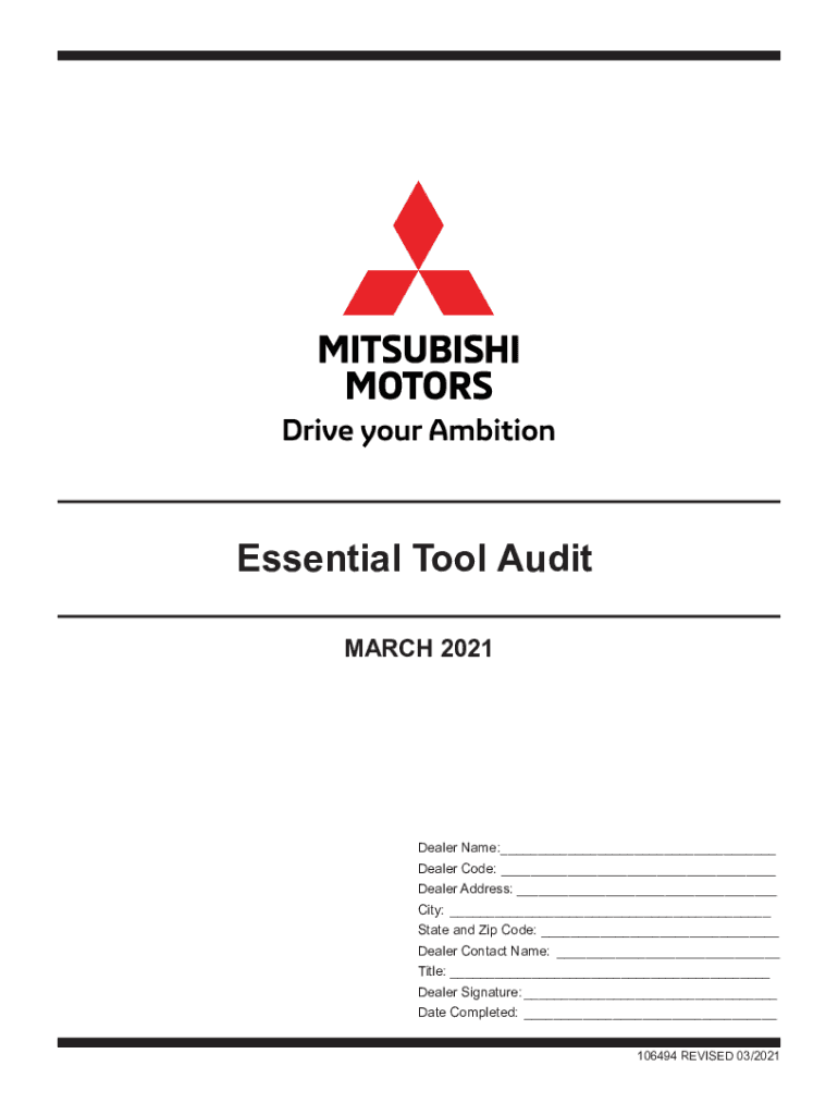 Essential Tool Audit MARCH 2021Dealer Name:___ Dealer Code: ___ Dealer Address: ___ City: ___ State and Zip Code: ___ Dealer Contact Name: ___ Title: ___ Dealer Signature: ___ Date Completed: ___