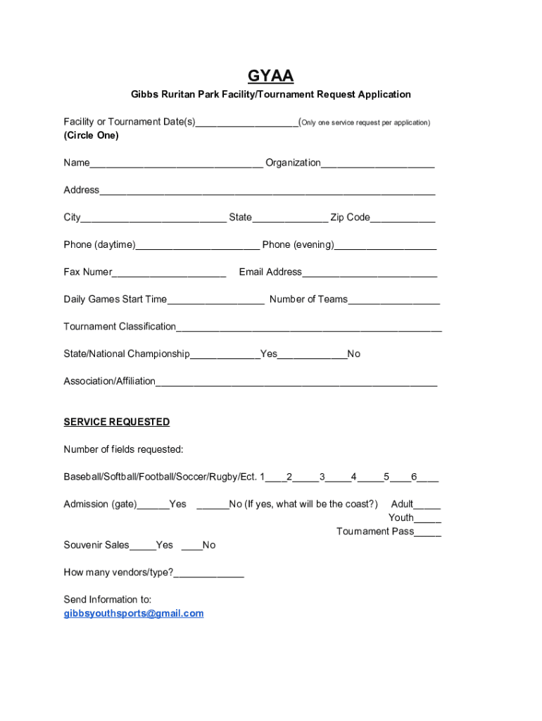 GAA Gibbs Puritan Park Facility/Tournament Request Application Facility or Tournament Date(s)___(Only one service request per application) (Circle One) Name___ Organization___ Address___ City___ State___