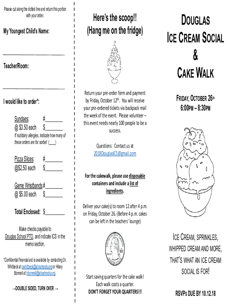 Please cut along the dotted line and return this portion with your order. My Youngest Child's Name:Here's the scoop!! (Hang me on the fridge)Teacher/Room:I would like to order*: Sundaes: @ $3.50 each#___