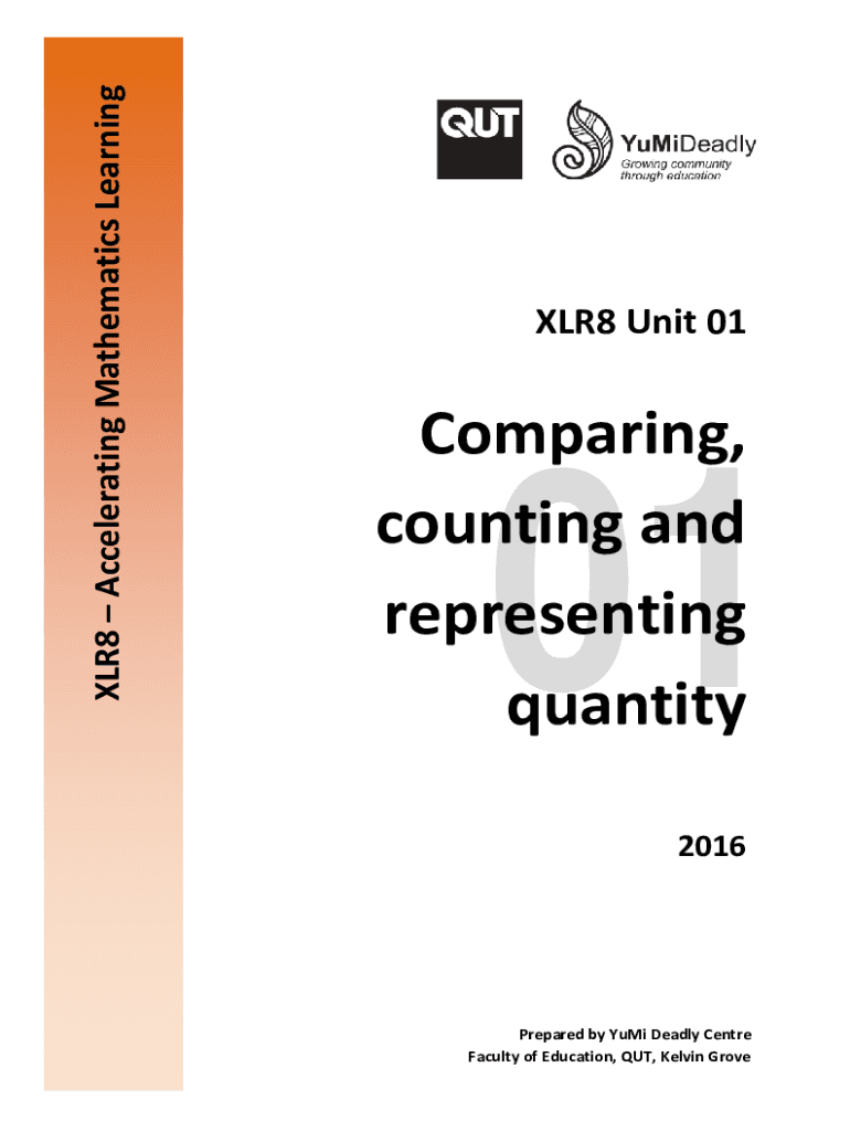 XLR8 Accelerating Mathematics LearningXLR8 Unit 0101Comparing, counting and representing quantity2016Prepared by Yuri Deadly Center Faculty of Education, BUT, Kelvin GroveACKNOWLEDGEMENTS We acknowledge