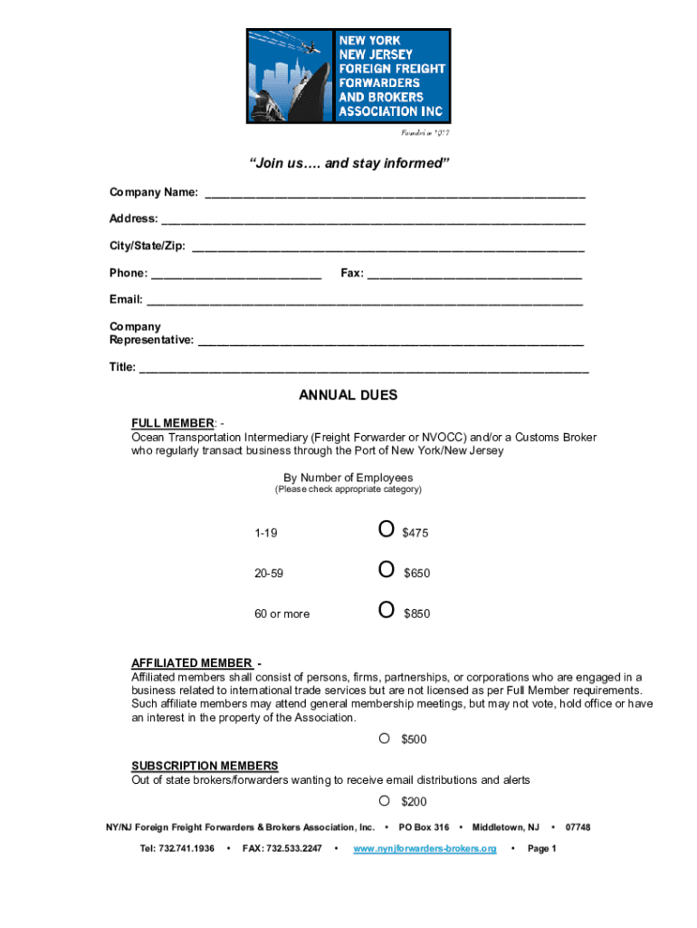 Join us. And stay informed Company Name: ___ Address: ___ City/State/Zip: ___ Phone: ___Fax: ___Email: ___ Company Representative: ___ Title: ___ANNUAL DUES FULL MEMBER: Ocean Transportation Intermediary