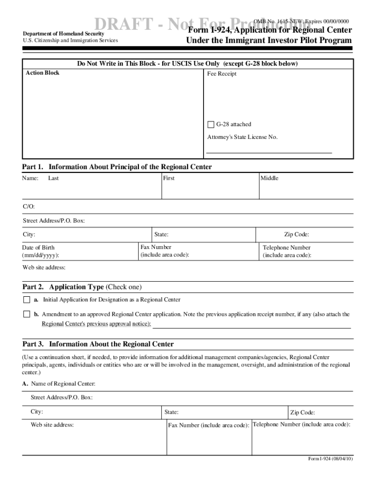 DRAFT Conform For I924,Production Application for Regional Center OMB No. 1615NEW; Expires 00/00/0000Department of Homeland Security U.S. Citizenship and Immigration ServicesUnder the Immigrant Investor