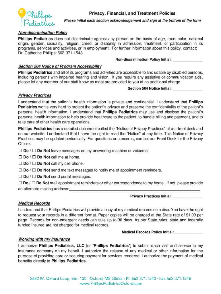 Privacy, Financial, and Treatment Policies Please initial each section acknowledgement and sign at the bottom of the formNondiscrimination Policy Phillips Pediatrics does not discriminate against