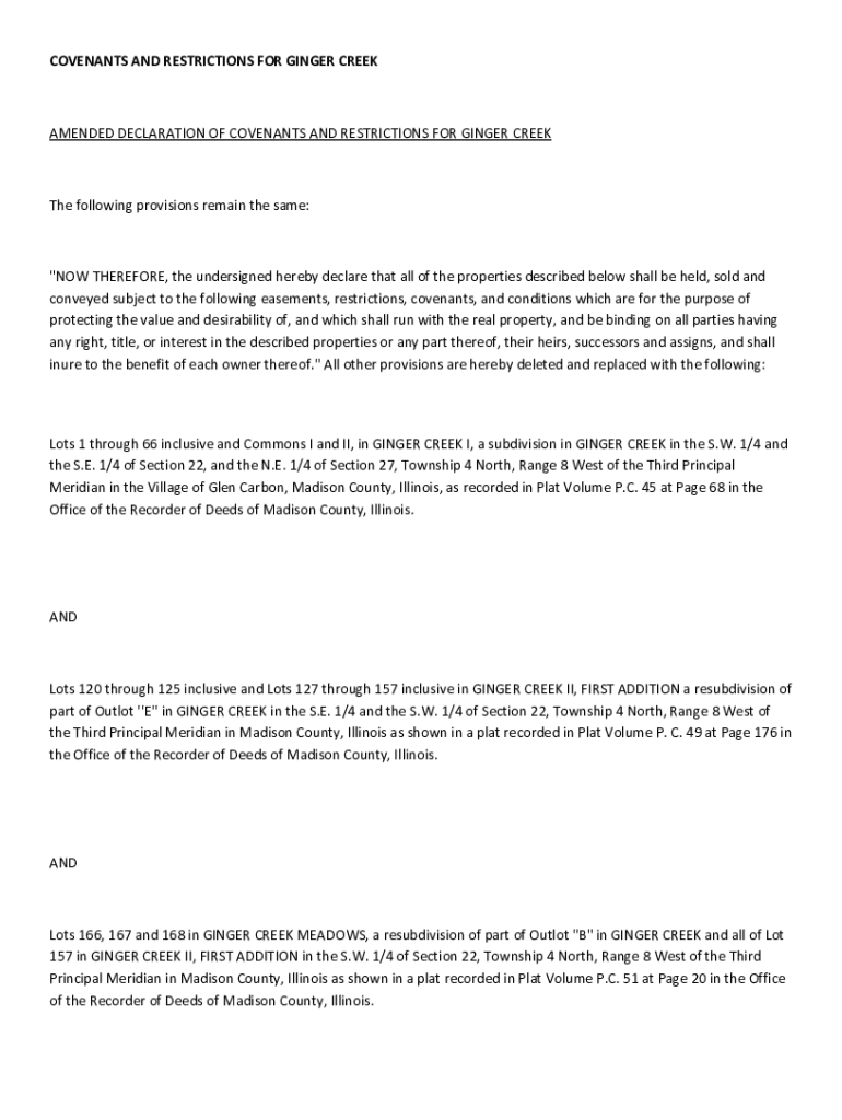 COVENANTS AND RESTRICTIONS FOR GINGER CREEKAMENDED DECLARATION OF COVENANTS AND RESTRICTIONS FOR GINGER Create following provisions remain the same:\” NOW THEREFORE, the undersigned hereby declare