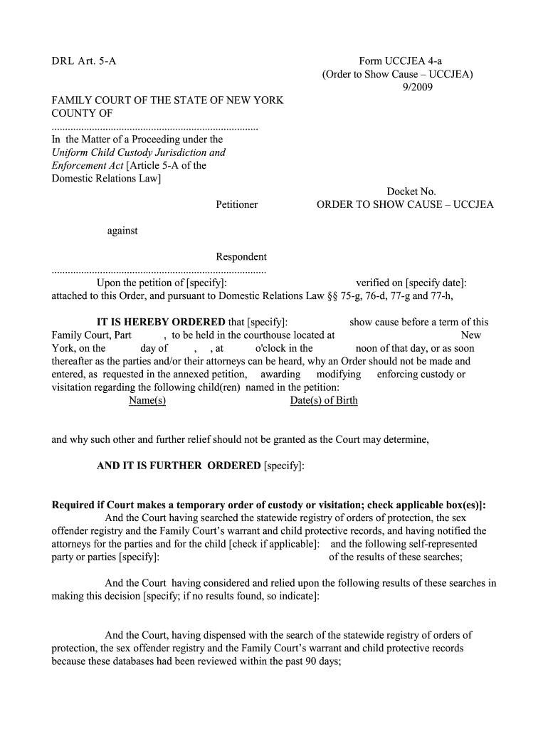 DR Art. 5-A Form McCrea 4-a (Order to Show Cause McCrea) 9/2009 FAMILY COURT OF THE STATE OF NEW YORK COUNTY OF ............................................................................. In the