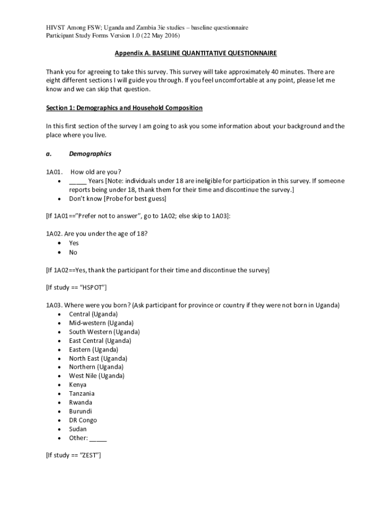 HIST Among FSW; Uganda and Zambia 3ie studies baseline questionnaire Participant Study Forms Version 1.0 (22 May 2016)Appendix A. BASELINE QUANTITATIVE QUESTIONNAIRE Thank you for agreeing to take