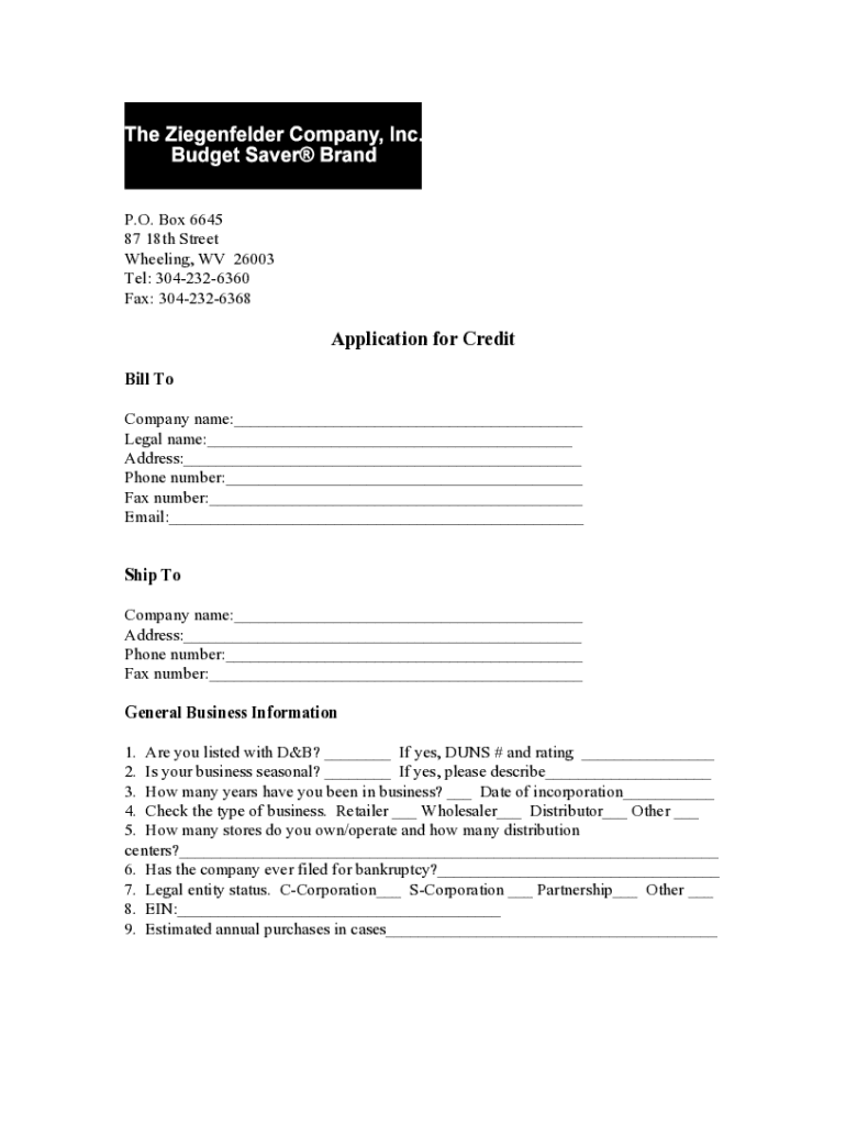 P.O. Box 6645 87 18th Street Wheeling, WV 26003 Tel: 3042326360 Fax: 3042326368Application for Credit Bill To Company name:___ Legal name:___ Address:___ Phone number:___ Fax number:___ Email:___