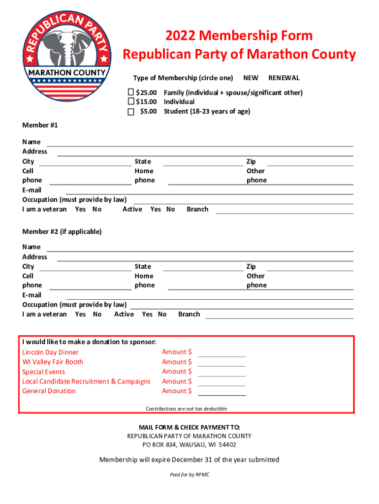 2022 Membership Form Republican Party of Marathon County Type of Membership (circle one)NEWRENEWAL$25.00 Family (individual + spouse/significant other) $15.00 Individual $5.00 Student (1823 years