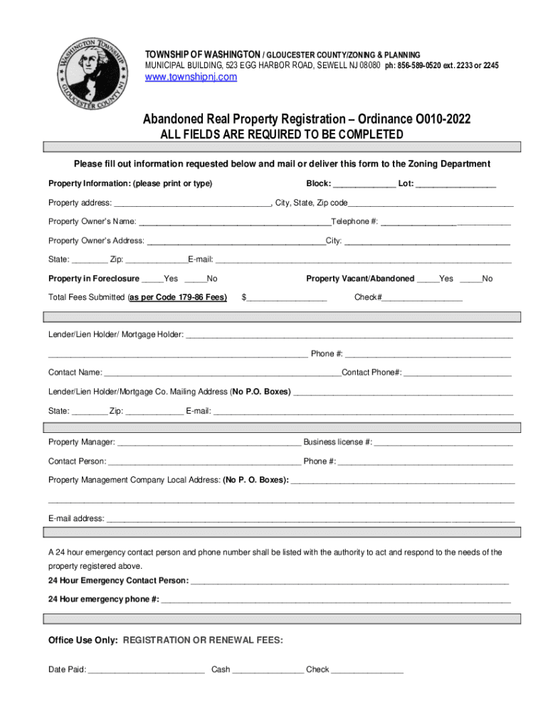 TOWNSHIP OF WASHINGTON / GLOUCESTER COUNTY/ZONING & PLANNINGMUNICIPAL BUILDING, 523 EGG HARBOR ROAD, SEWELL NJ 08080 pH: 8565890520 ext. 2233 or 2245www.township.abandoned Real Property Registration