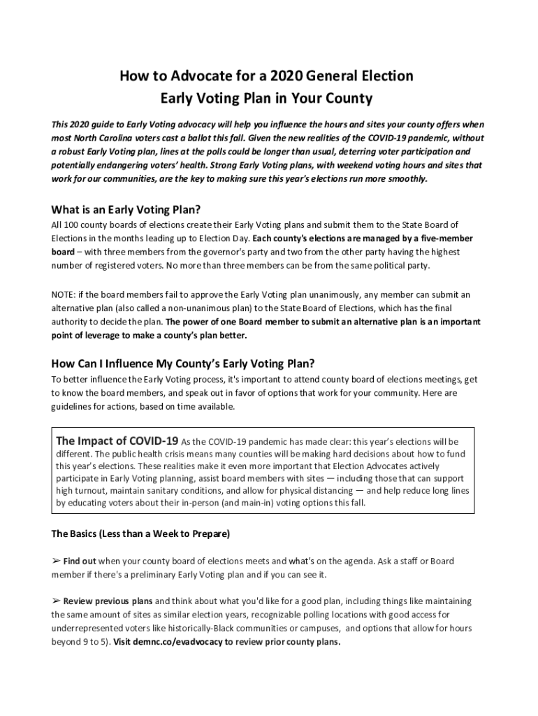 How to Advocate for a 2020 General Election Early Voting Plan in Your County This 2020 guide to Early Voting advocacy will help you influence the hours and sites your county offers when most North