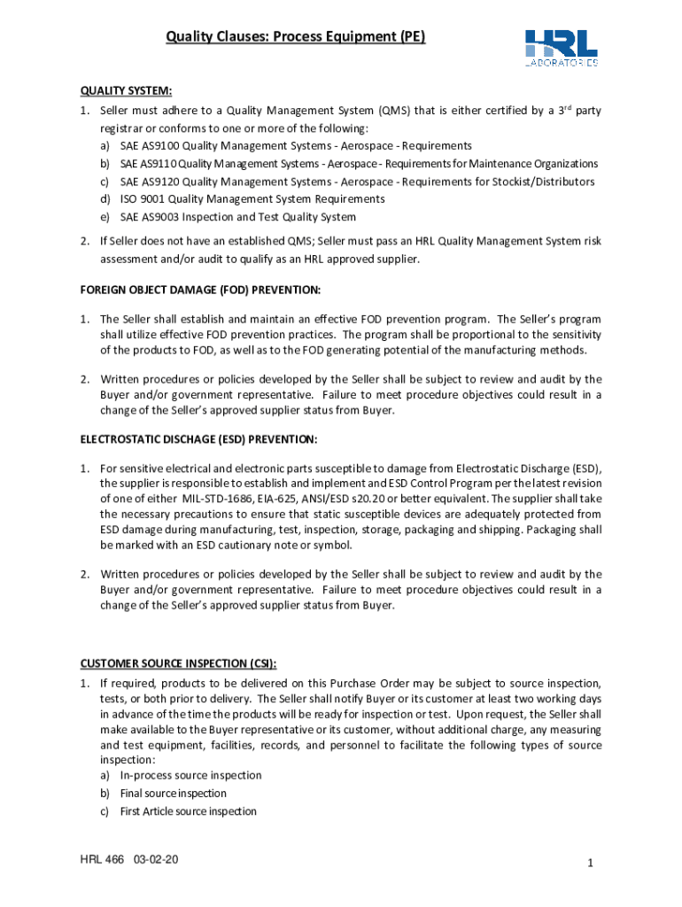 Quality Clauses: Process Equipment (PE) QUALITY SYSTEM: 1. Seller must adhere to a Quality Management System (RMS) that is either certified by a 3rd party registrar or conforms to one or more of the