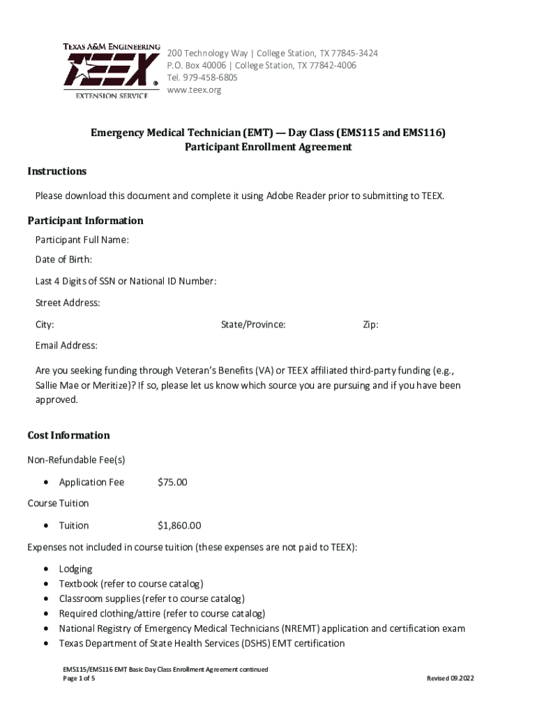 200 Technology Way | College Station, TX 778453424 P.O. Box 40006 | College Station, TX 778424006 Tel. 9794586805 www.teex.orgEmergency Medical Technician (EMT) Day Class (EMS115 and EMS116) Participant