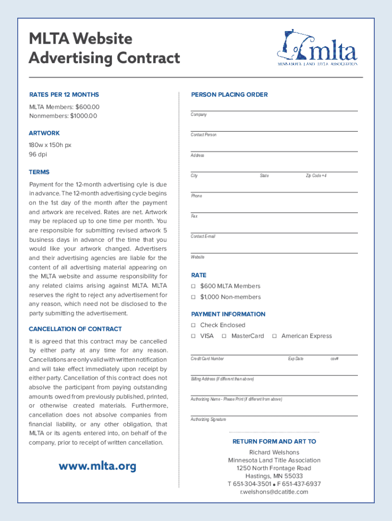 MALTA Website Advertising Contract RATES PER 12 MONTHS MALTA Members: $600.00 Nonmembers: $1000.00PERSON PLACING ORDER CompanyARTWORKContact Person180w x 150h PX 96 dpiAddressTERMSCityStateZip Code