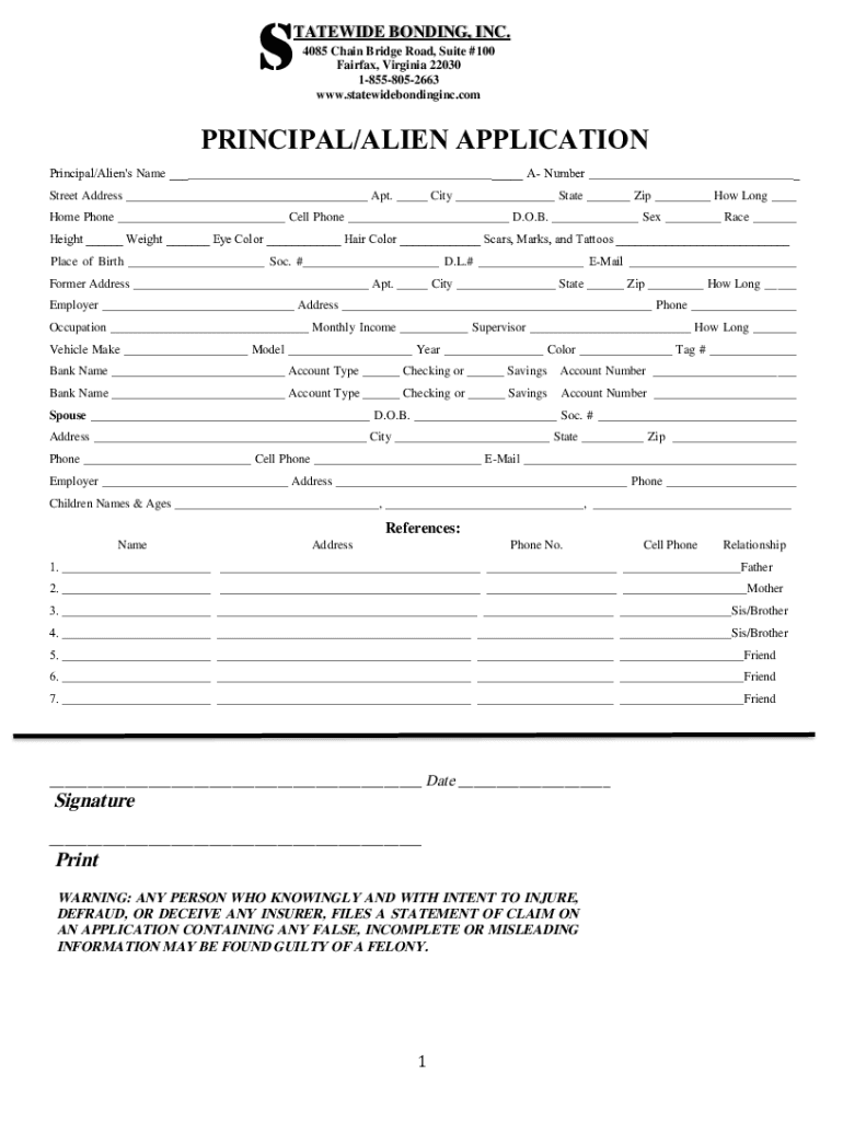 STATEWIDE BONDING, INC. 4085 Chain Bridge Road, Suite #100 Fairfax, Virginia 22030 18558052663 www.statewidebondinginc.comPRINCIPAL/ALIEN APPLICATION Principal/Alien\'s Name ___ A Number ___ Street