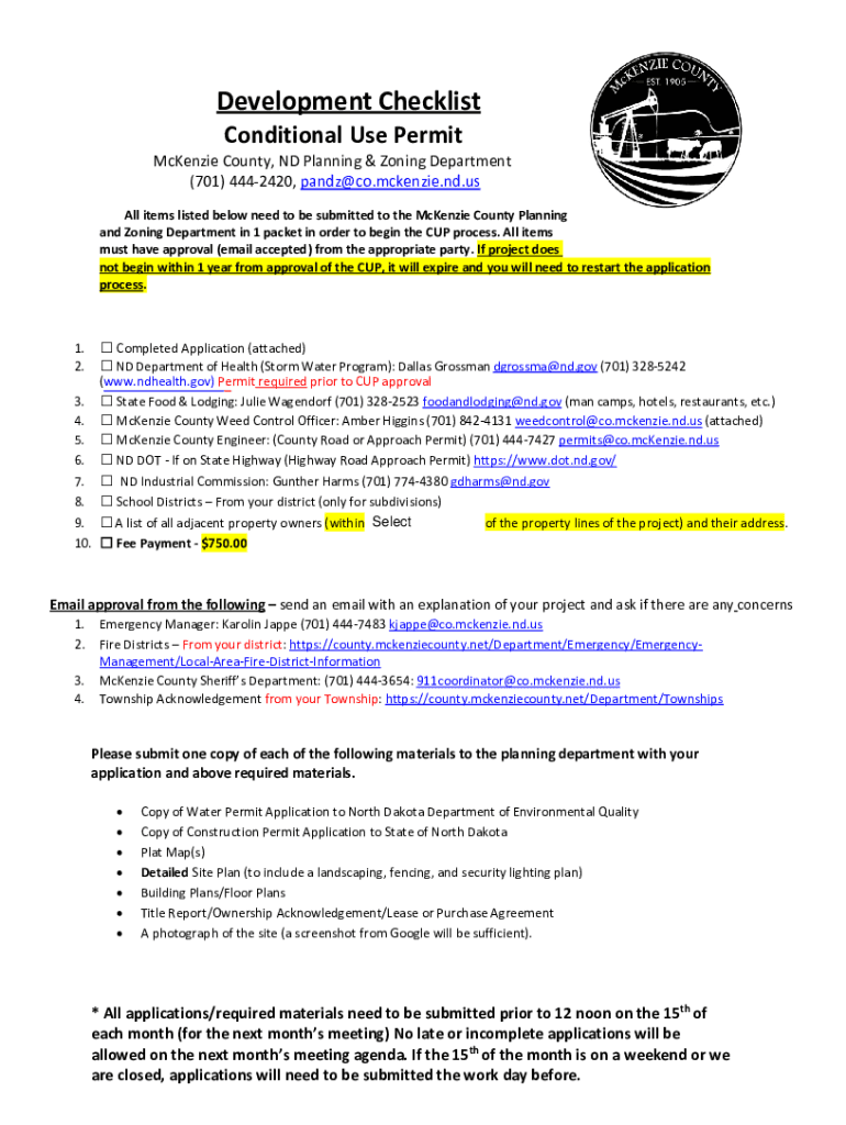Development Checklist Conditional Use Permit McKenzie County, ND Planning & Zoning Department (701) 4442420, pandz@co.mckenzie.nd.us All items listed below need to be submitted to the McKenzie County