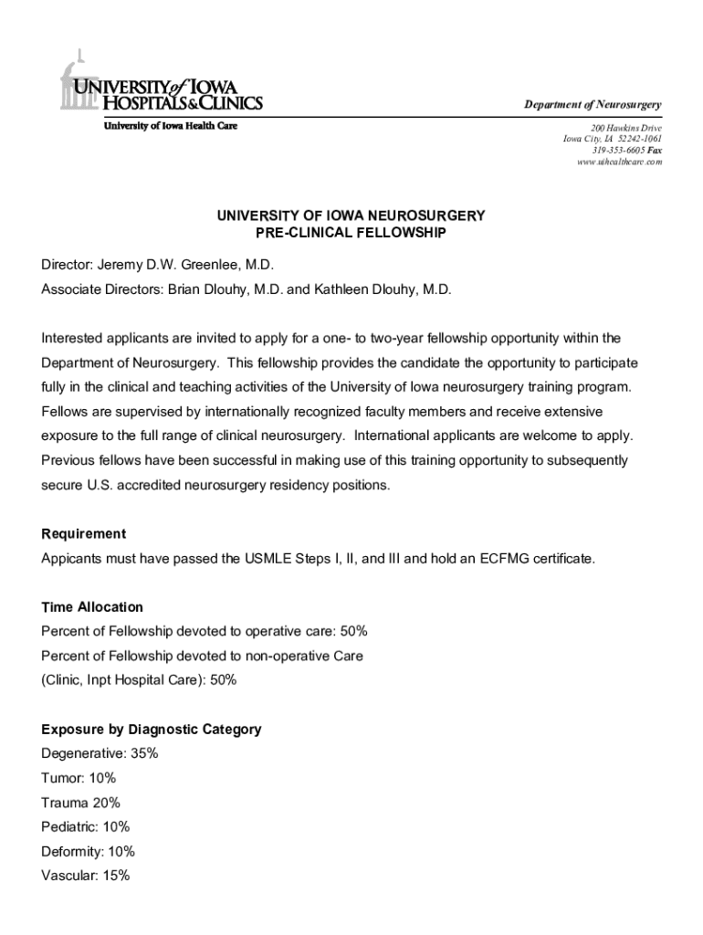 Department of Neurosurgery 200 Hawkins Drive Iowa City, IA 522421061 3193536605 Fax www.uihealthcare.comUNIVERSITY OF IOWA NEUROSURGERY PRECLINICAL FELLOWSHIP Director: Jeremy D.W. Green lee, M.D.