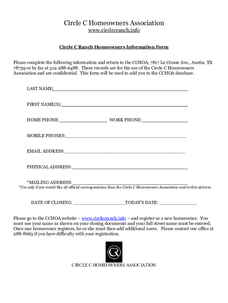 Circle C Homeowners Association www.circlecranch.info Circle C Ranch Homeowners Information Form Please complete the following information and return to the OCHOA, 7817 La Crosse Ave., Austin, TX