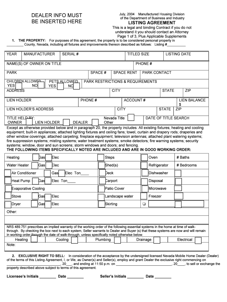 July 2004 Manufactured Housing Division of the Department of Business and Industry DEALER INFO MUST BE INSERTED HERE LISTING AGREEMENT This is a legal and binding Contract if you do not understand