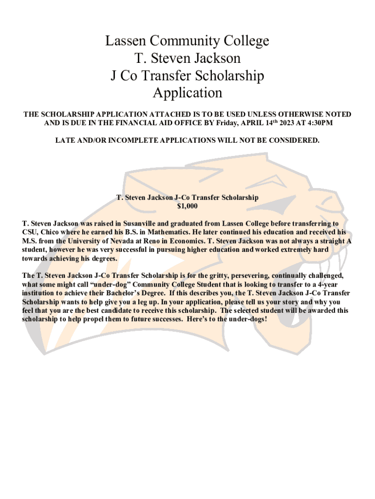 Lassen Community College T. Steven Jackson J Co Transfer Scholarship Application THE SCHOLARSHIP APPLICATION ATTACHED IS TO BE USED UNLESS OTHERWISE NOTED AND IS DUE IN THE FINANCIAL AID OFFICE BY