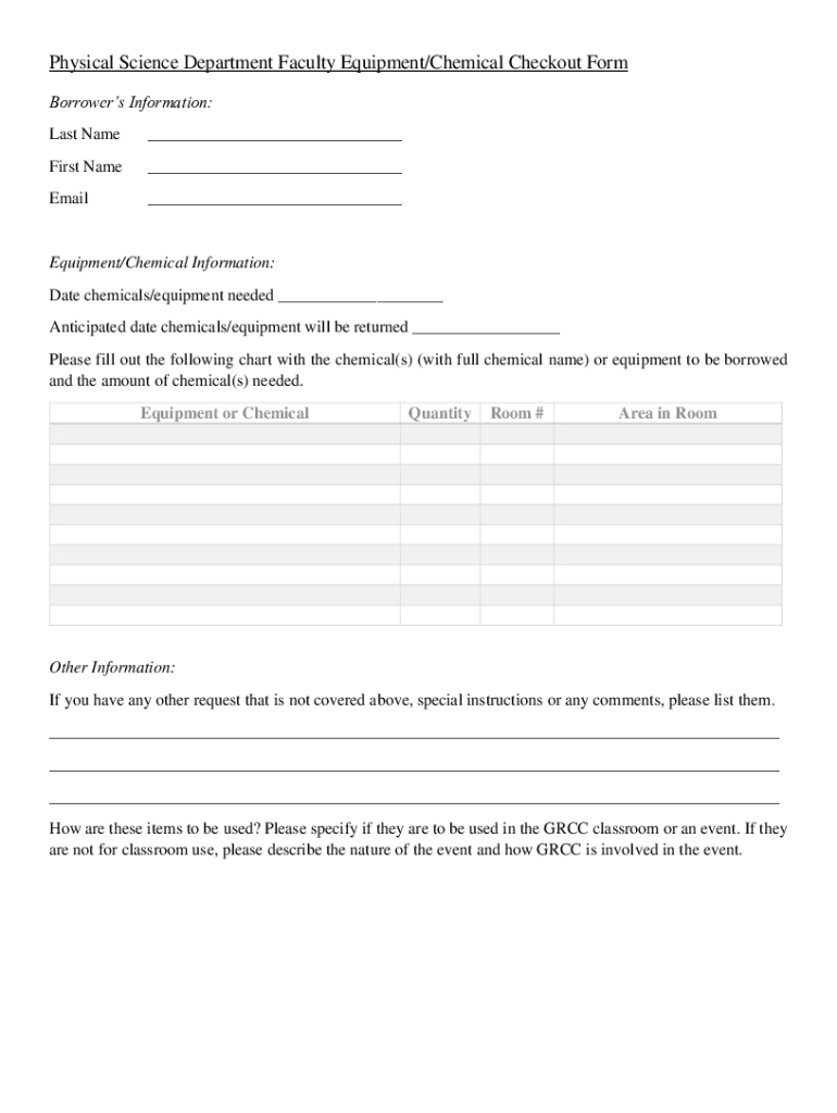 Physical Science Department Faculty Equipment/Chemical Checkout Form Borrowers Information: Last Name___First Name___Email___Equipment/Chemical Information: Date chemicals/equipment needed ___ Anticipated