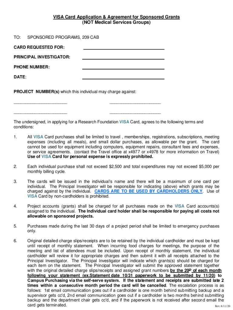 VISA Card Application & Agreement for Sponsored Grants (NOT Medical Services Groups) TO:SPONSORED PROGRAMS, 209 ABOARD REQUESTED FOR: PRINCIPAL INVESTIGATOR: PHONE NUMBER: DATE:PROJECT NUMBER(s) which