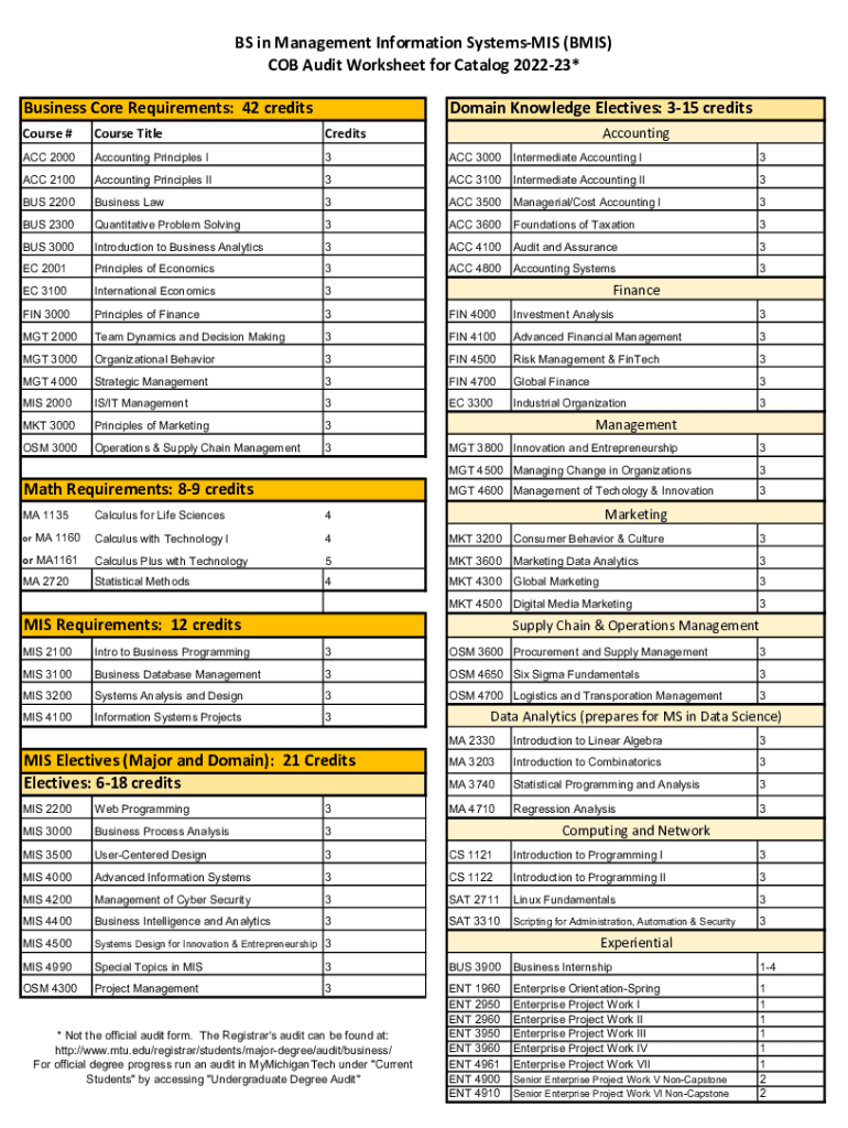 BS in Management Information Systems (BMS) COB Audit Worksheet for Catalog 202223* Business Core Requirements: 42 credits Student Name:Domain Knowledge Electives: 315 credits Graduation Semester Goal: