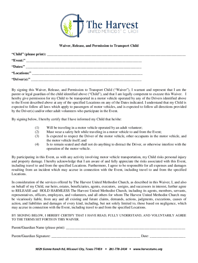 Waiver, Release, and Permission to Transport Child (please print): ___ Event: ___ Dates: ___ Locations: ___ Driver(s): ___ By signing this Waiver, Release, and Permission to Transport Child (Waiver),