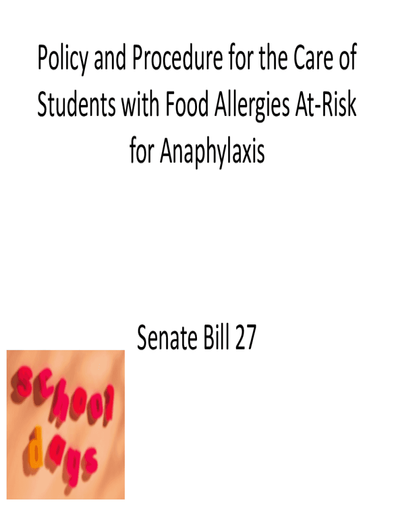 Policy and Procedure for the Care of Students with Food Allergies Risk for AnaphylaxisSenate Bill 27Introduction The Commissioner of the Texas Department of State Health Services (DSS) in consultation