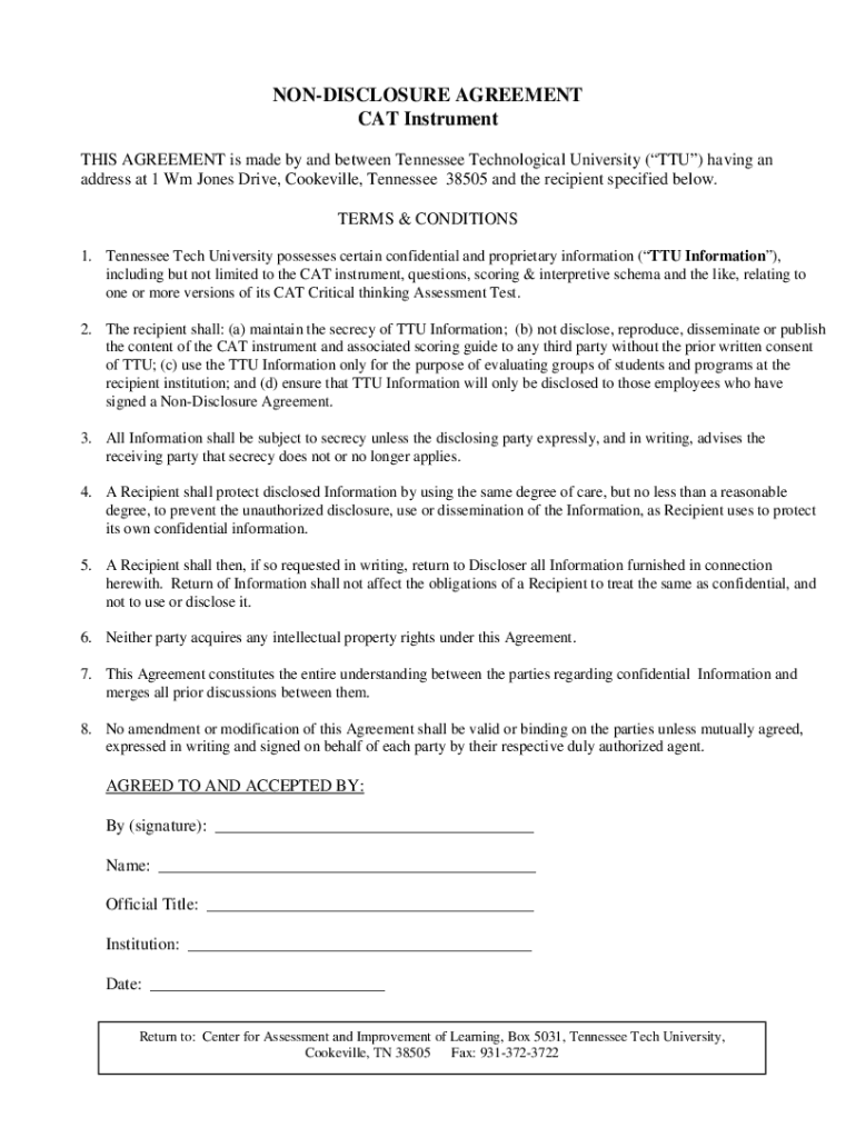NONDISCLOSURE AGREEMENT CAT Instruments THIS AGREEMENT is made by and between Tennessee Technological University (TTU) having an address at 1 Wm Jones Drive, Cookeville, Tennessee 38505 and the recipient