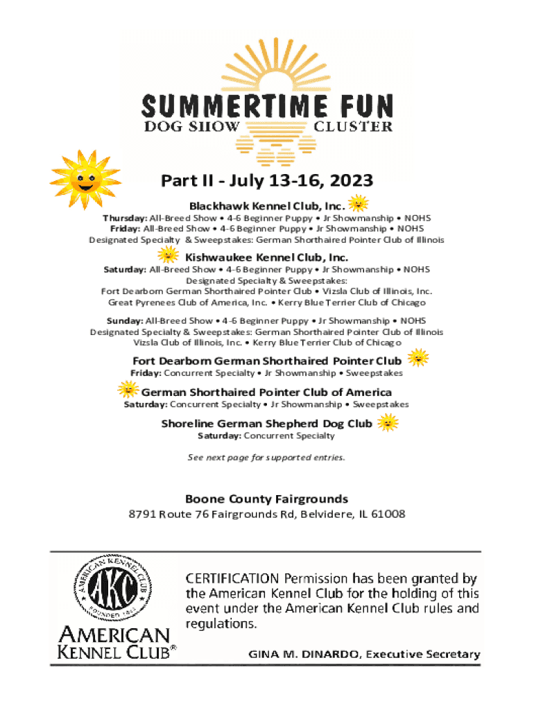 Part II July 1316, 2023 Black hawk Kennel Club, Inc. Thursday: Allured Show 46 Beginner Puppy Jr Showmanship NHS Friday: Allured Show 46 Beginner Puppy Jr Showmanship NHS Designated Specialty & Sweepstakes: