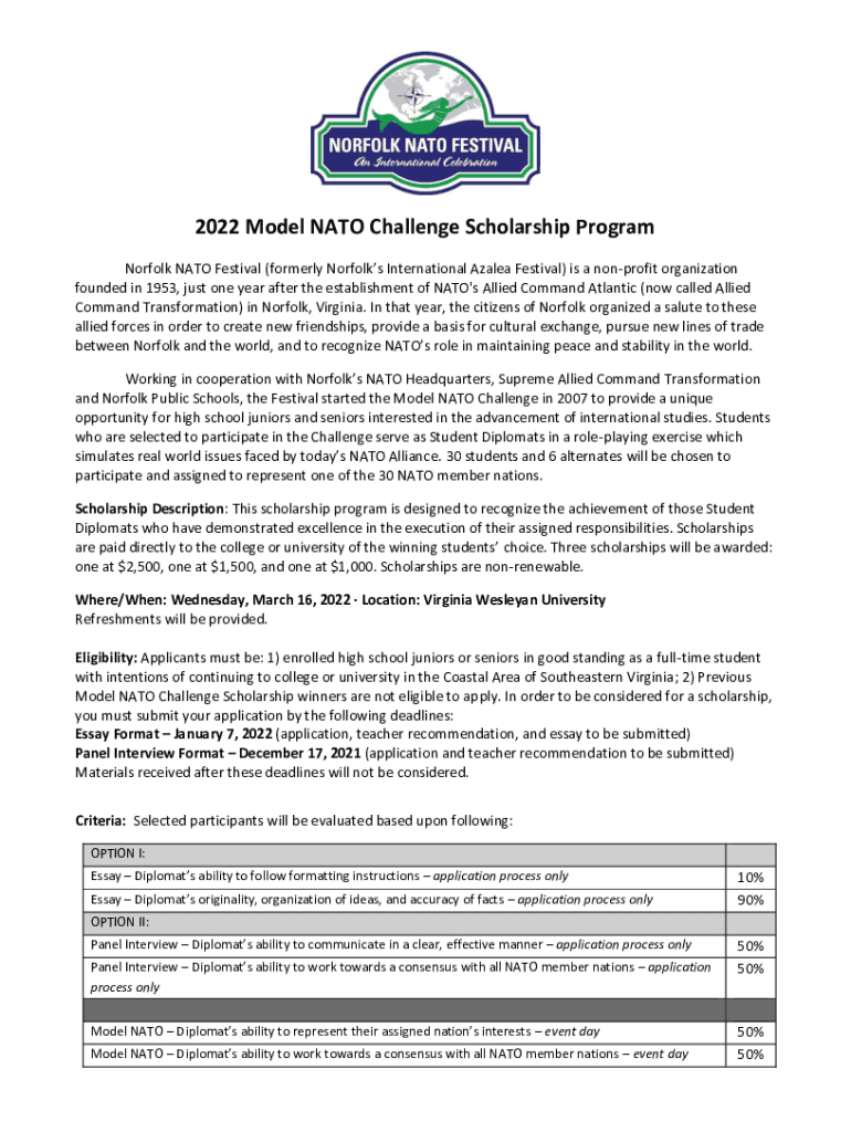 2022 Model NATO Challenge Scholarship Program Norfolk NATO Festival (formerly Norfolk's International Azalea Festival) is a nonprofit organization founded in 1953, just one year after the establishment