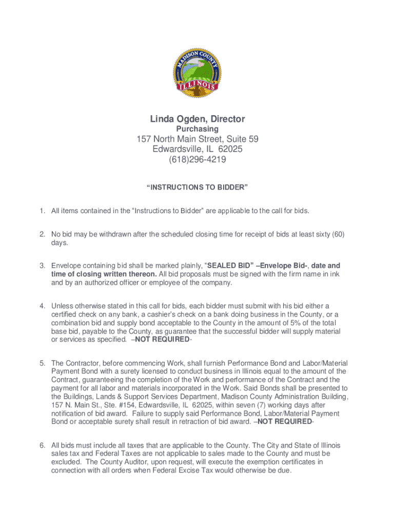 Linda Ogden, Director Purchasing157 North Main Street, Suite 59 Edwardsville, IL 62025 (618)2964219 INSTRUCTIONS TO BIDDER 1. All items contained in the Instructions to Bidder are applicable to the
