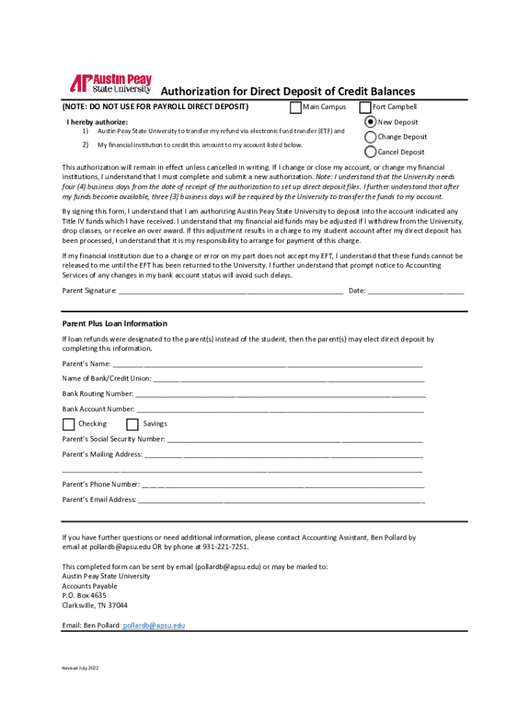 Authorization for Direct Deposit of Credit Balances