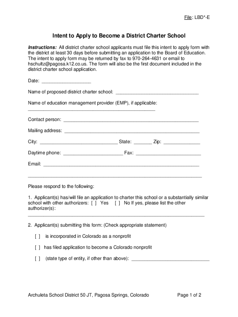 File: LBD×Intent to Apply to Become a District Charter School Instructions: All district charter school applicants must file this intent to apply form with the district at least 30 days before submitting