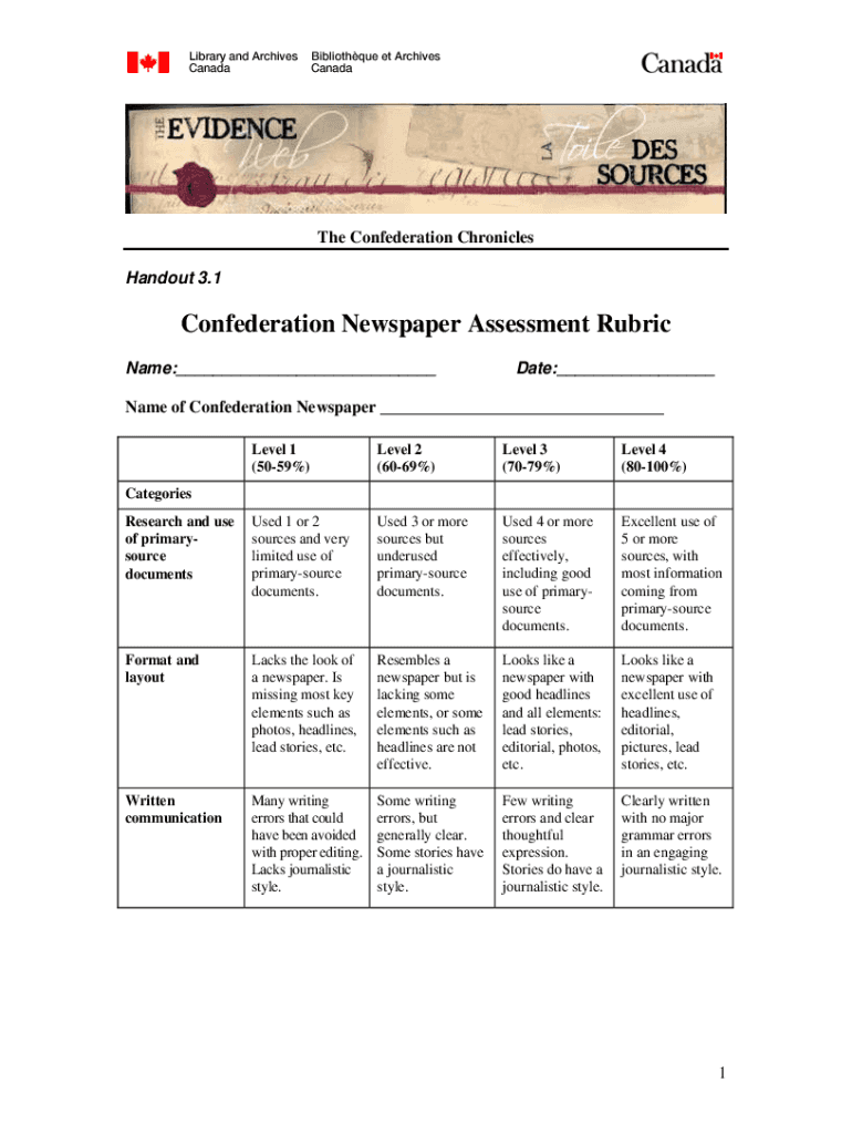 Confederation newspaper assessment rubric is a set of criteria used to evaluate newspapers for their compliance with confederation standards and guidelines.