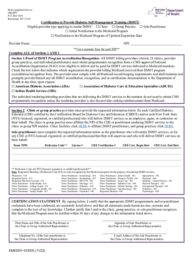 Mail completed form to: remedy P.O. Box 4610 Rensselaer, NY 12144Certification to Provide Diabetes Self-management Training (DSM) Eligible provider type applying to render DSM: Clinic Group Practice