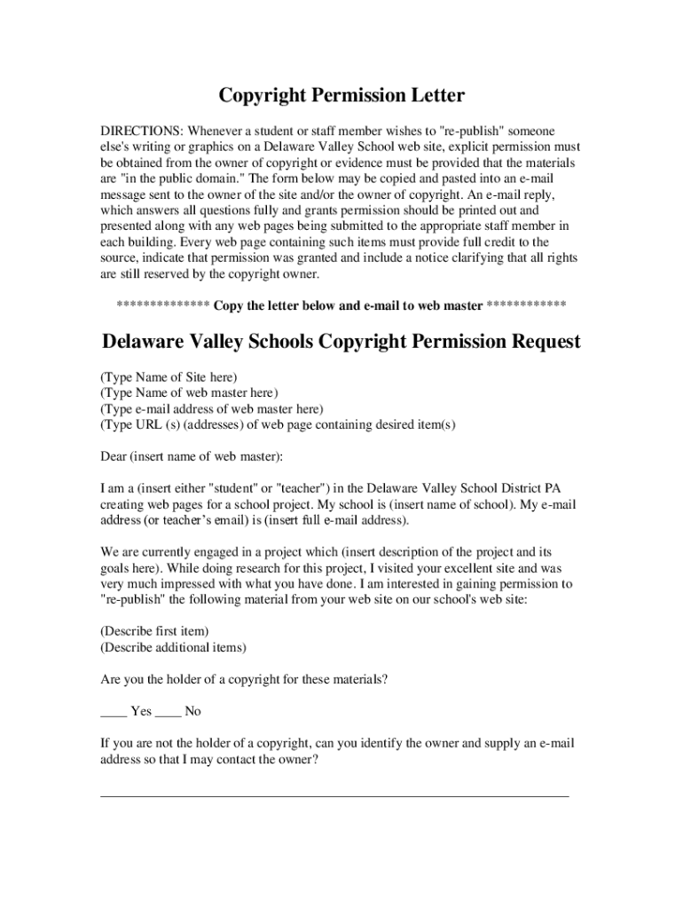 Copyright Permission Letter DIRECTIONS: Whenever a student or staff member wishes to \” republish\” someone else\'s writing or graphics on a Delaware Valley School website, explicit permission