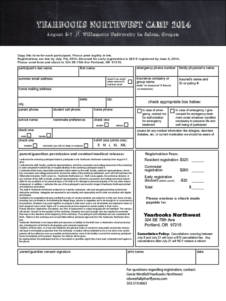 YEARBOOKS NORTHWEST CAMP 2014 August 57 u Willamette University in Salem, OregonCopy this form for each participant. Please print legibly in ink. Registrations are due by July 7th, 2014. Discount