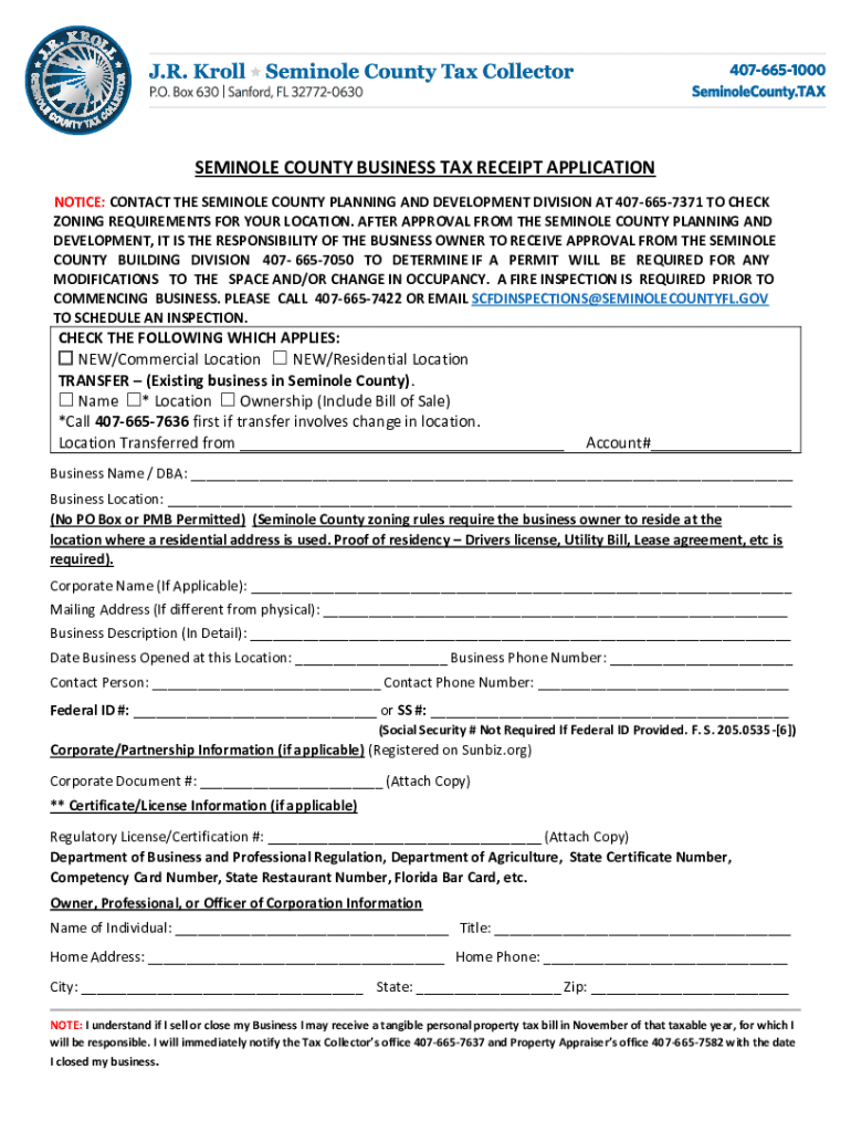 SEMINOLE COUNTY BUSINESS TAX RECEIPT APPLICATION NOTICE: CONTACT THE SEMINOLE COUNTY PLANNING AND DEVELOPMENT DIVISION AT 4076657371 TO CHECK ZONING REQUIREMENTS FOR YOUR LOCATION. AFTER APPROVAL
